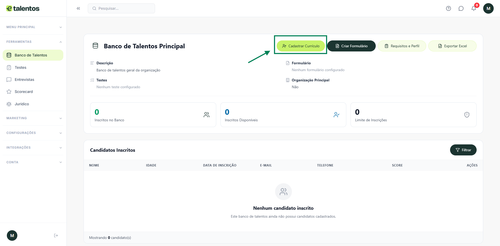 Na página de currículo, selecione a opção “Banco de Talentos”.