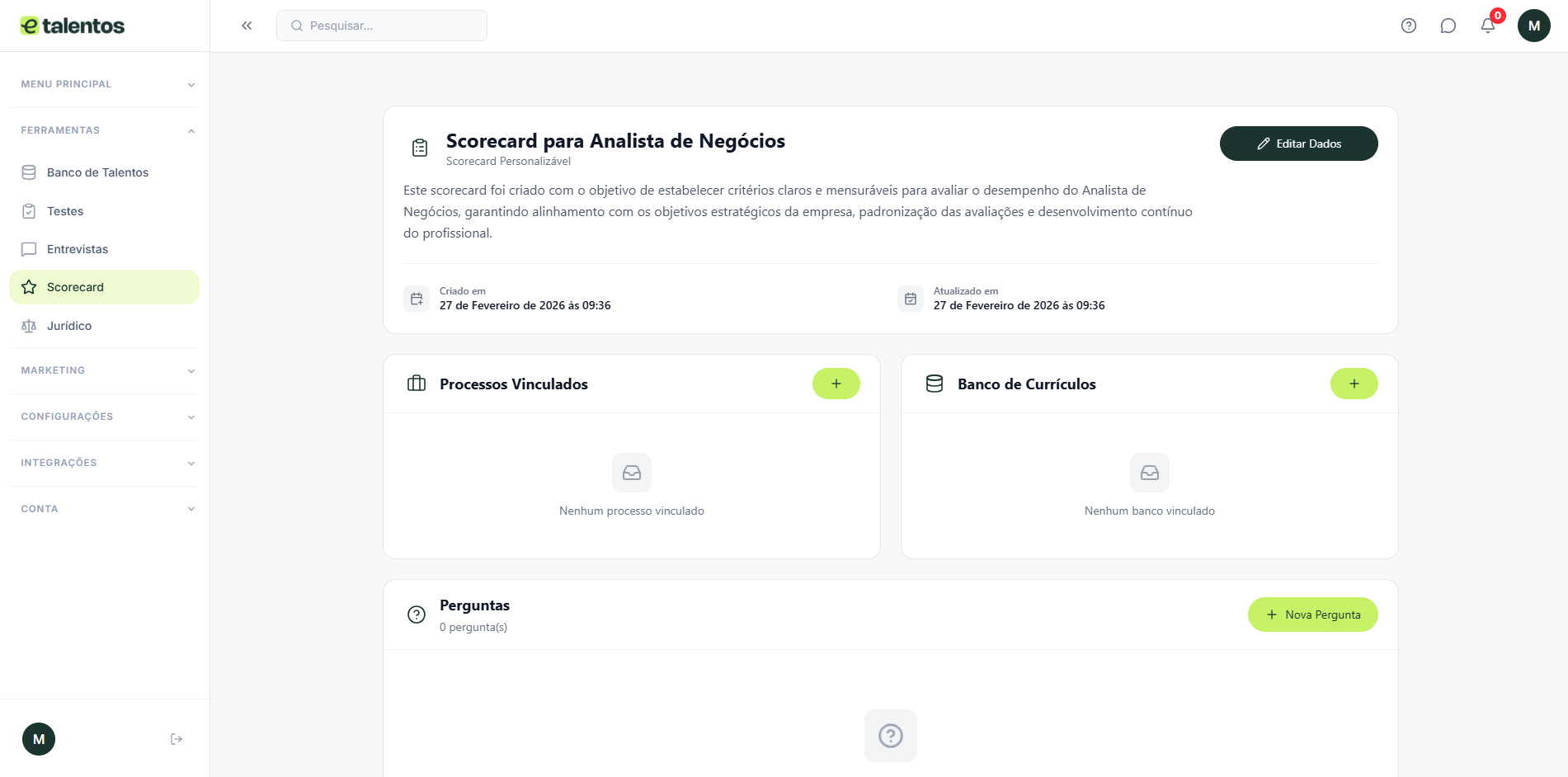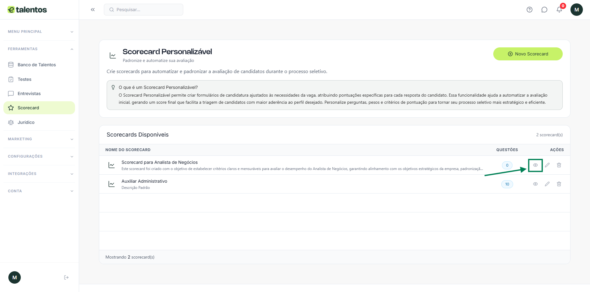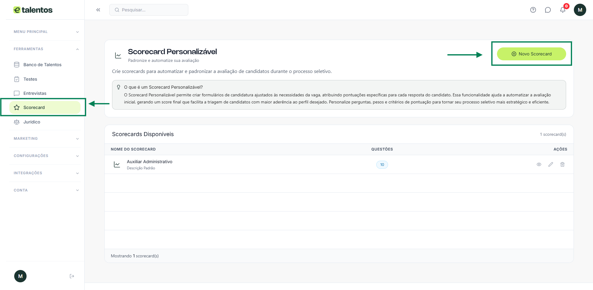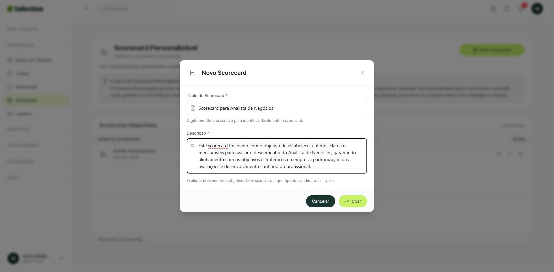 Na E-talentos, os scorecard podem ser criados e vinculados ao banco de talentos, otimizando a coleta de informações dos candidatos e tornando a triagem mais precisa e estruturada.