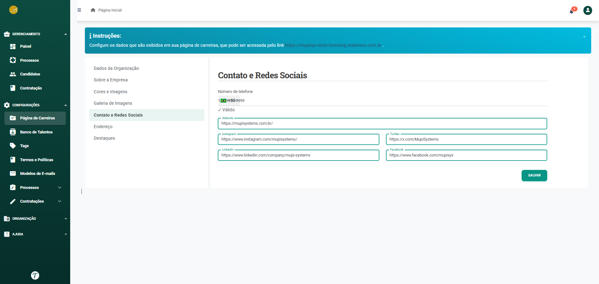 • Informações da organização (nome, sigla sem espaços ou caracteres especiais, slogan, e-mail, endereço, links de redes sociais).