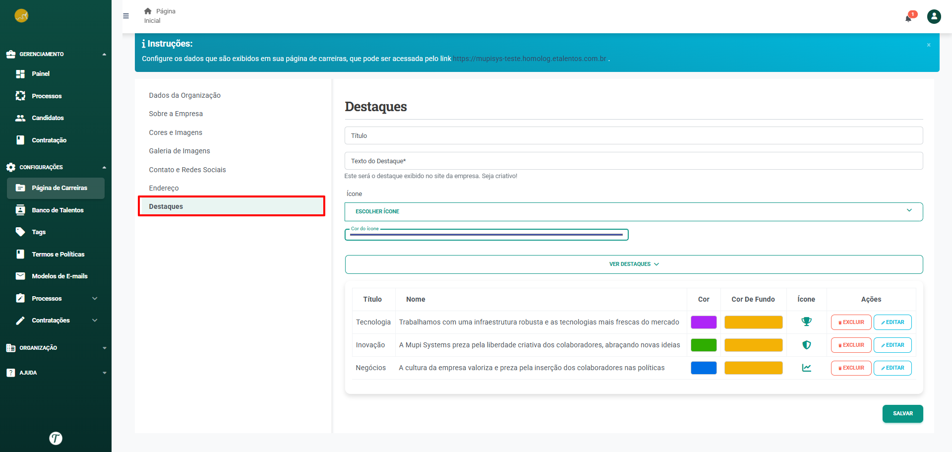 • Configure processos seletivos e banco de talentos em outras seções para exibição automática.