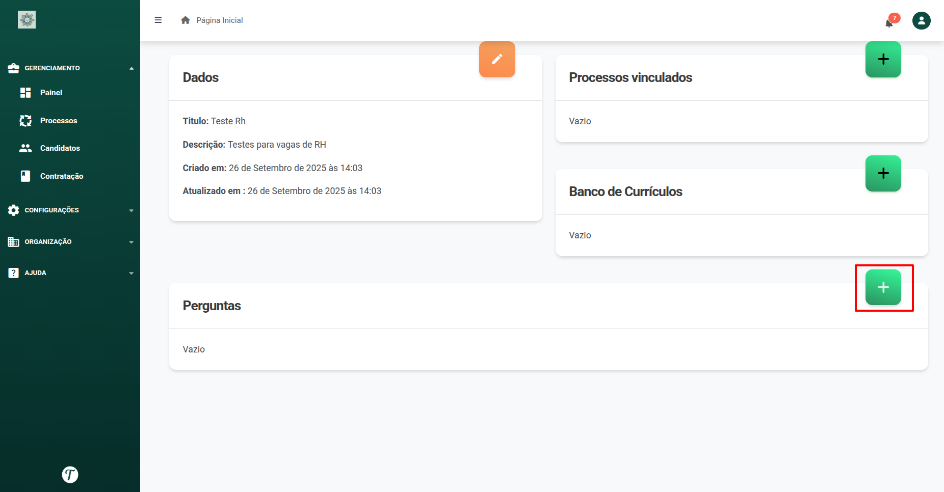 A plataforma ira gerar perguntas automaticamente, com base nas informações preenchidas sobre a vaga.