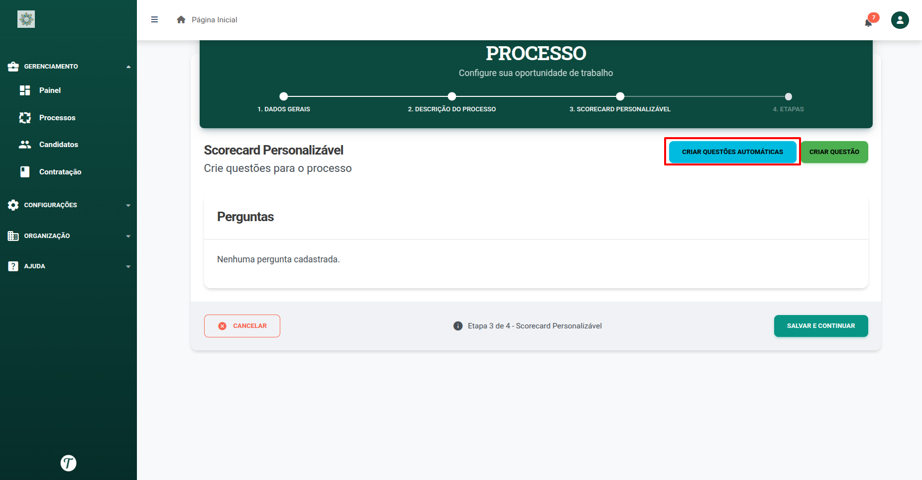 Na etapa de Scorecard Personalizável, clique em Criar Questões Automáticas, para gerar um scorecard de acordo o título de sua vaga: