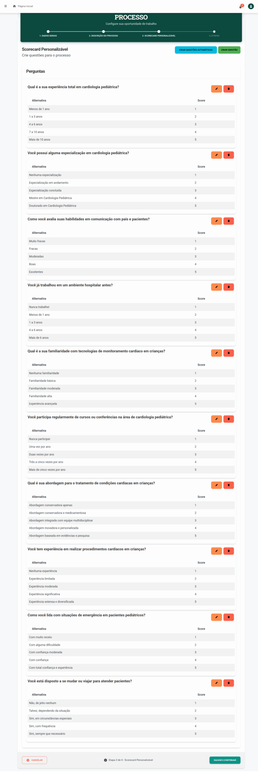 Dica: Use o score para refletir valores culturais ou competências técnicas prioritárias para a vaga.