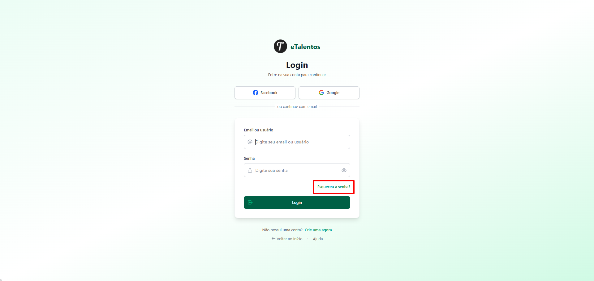 1. Insira o e-mail registrado na sua conta eTalentos.